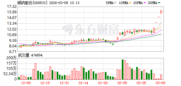 顺钠股份盘中涨停,已连收4个涨停板,截至9:31,该股报16.37元,换手率6.16%,成交量4216.51万股,成交金额6.75亿元,涨停板封单金额为3.85亿元。连续涨停期间,该股累计上涨46.42%,累计换手率为17.17%。最新A股总市值达113.09亿元,A股流通市值112.12亿元。