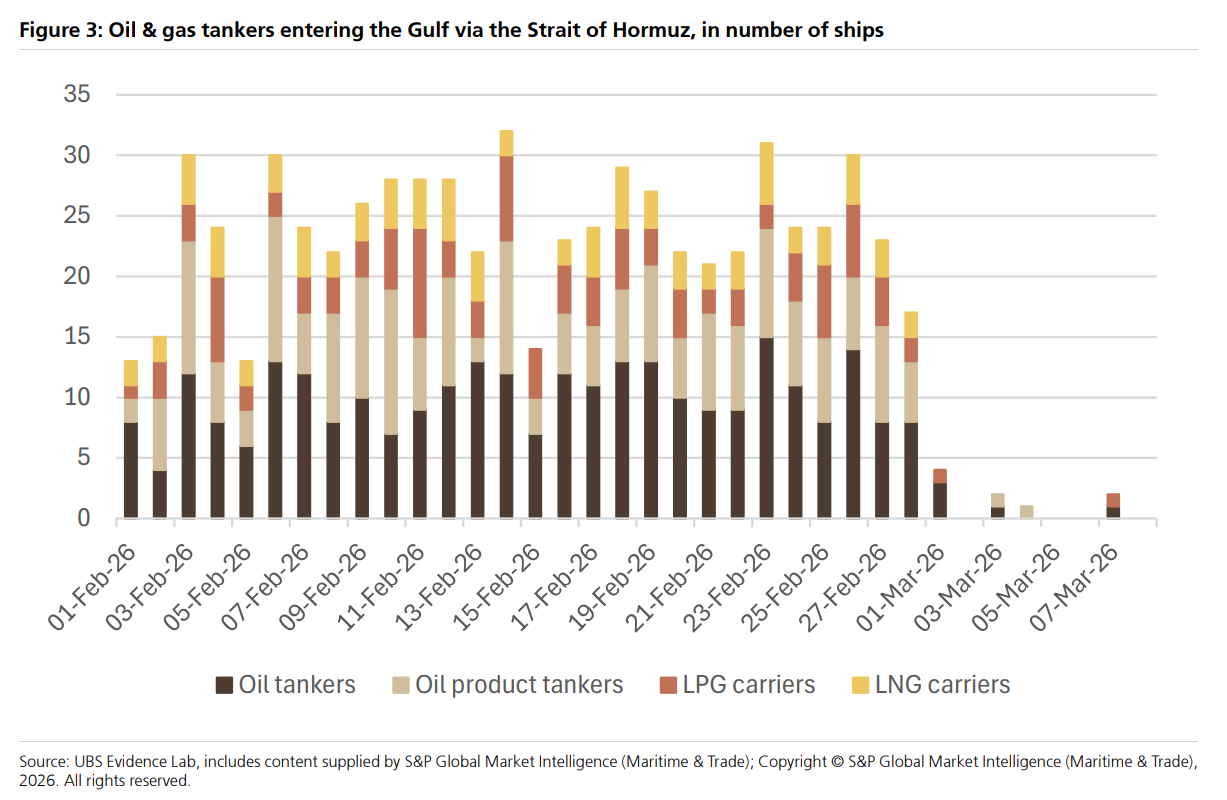 根据瑞银发布"霍尔木兹航运追踪器",2月份每日通过霍尔木兹的油气轮船约50艘,目前已骤降至1至2艘。
